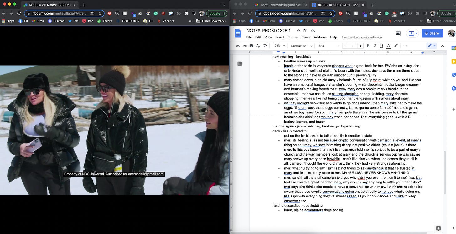 Watching a new episode of The Real Housewives of Salt Lake City last week like a normal fan instead of a transcriptionist for the first time ever. Absolute bliss