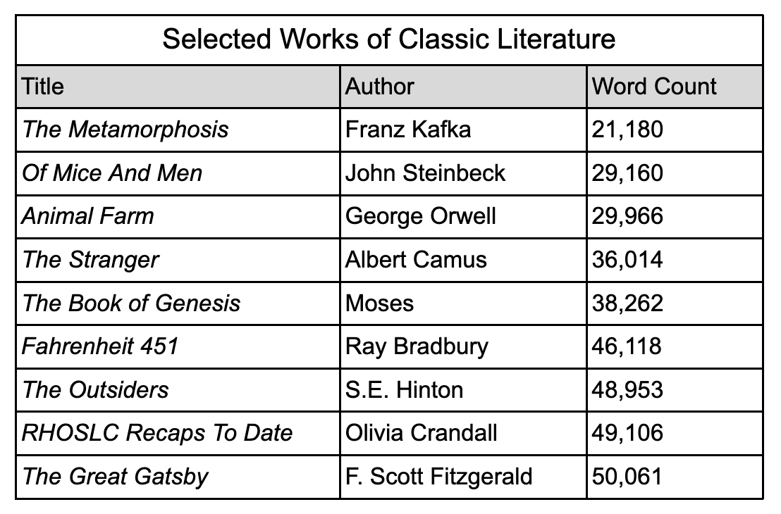 When I was compiling data for the above chart, my gut reaction upon seeing Gatsby’s word count was, “ooh maybe you can sub for the new recapper to close that gap real quick. Two more after that and you’d be longer than The Hours by Michael Cunningham, which feels appropriate…” And that, my friends, is why I am cutting myself off! More is not always more.